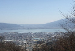展望台の後ろ側から諏訪湖を望む白い富士がうっすらと湖の向こうの右手の山の後ろに見えていたのですが、安物のデジカメ写真では分かりませんね 画像を拡大すると、何とかそれらしいものがあることは分かりますが