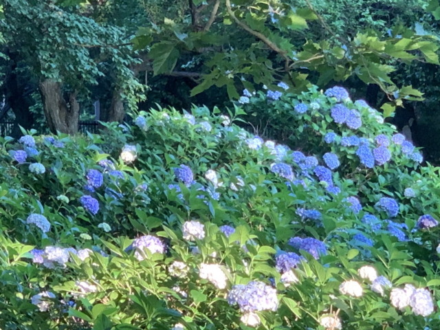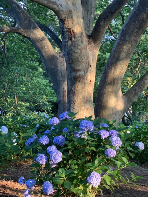 紫陽花と大木は、モミジバスズカケです。スズカケノキとアメリカスズカケノキの交配種です。公園の中で最も大きな樹木で、3本に別れていますが、一本の幹の周りは、2メートル有ります。