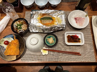 18:07 宿の夕食 サシミは何か聞くのを忘れた