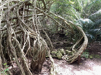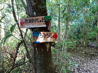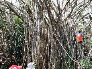 道標にあった『がじゅまる』 がじゅまるは明治期に導入され、砂糖製造場や農作業小屋に 木陰を作ったり、防風用に植栽された しかし現在では生態系に 重大な脅威を与える侵略的外来種の絞め殺し植物であるが、 対策はまだ何も取られていないとのこと