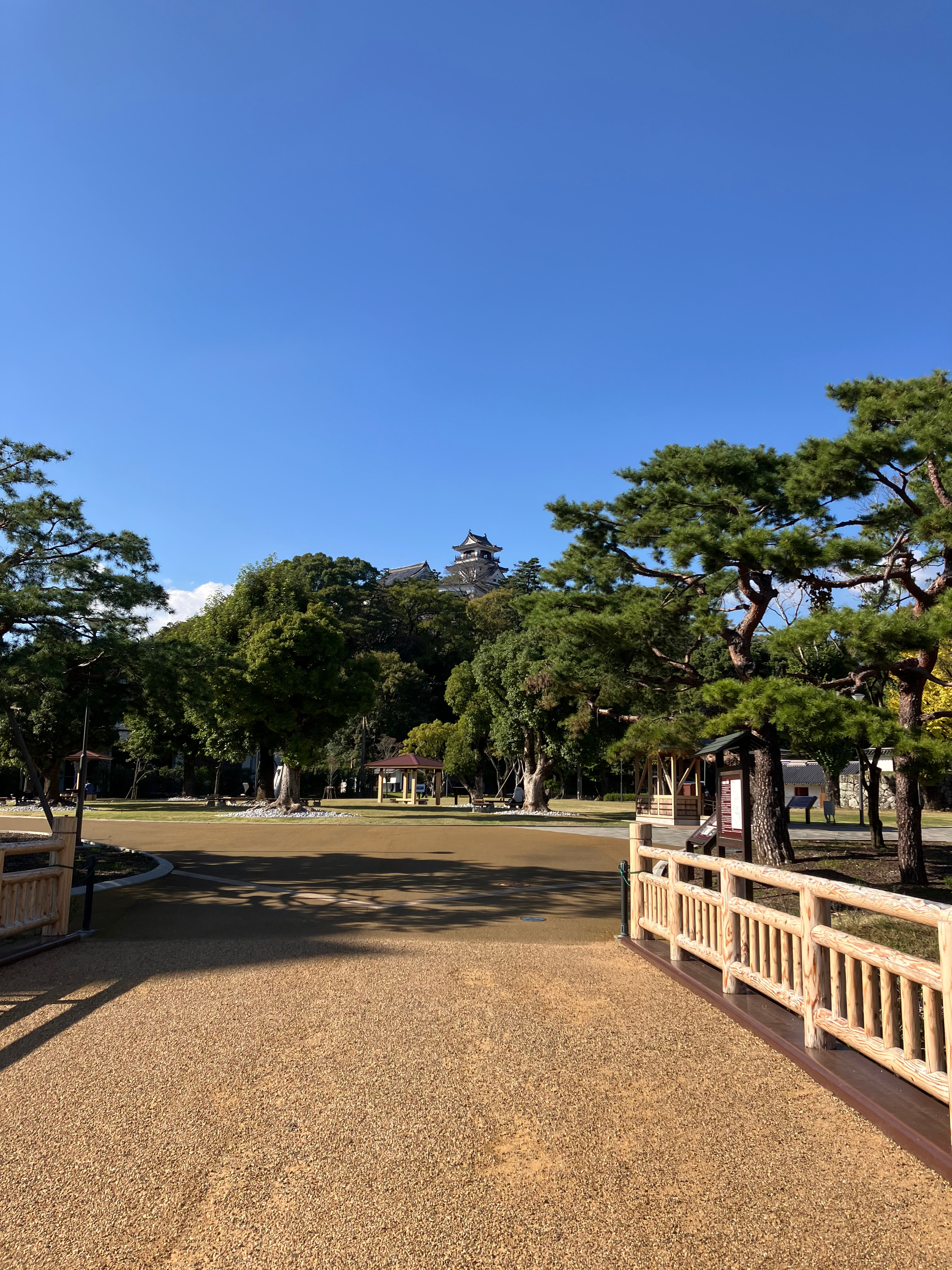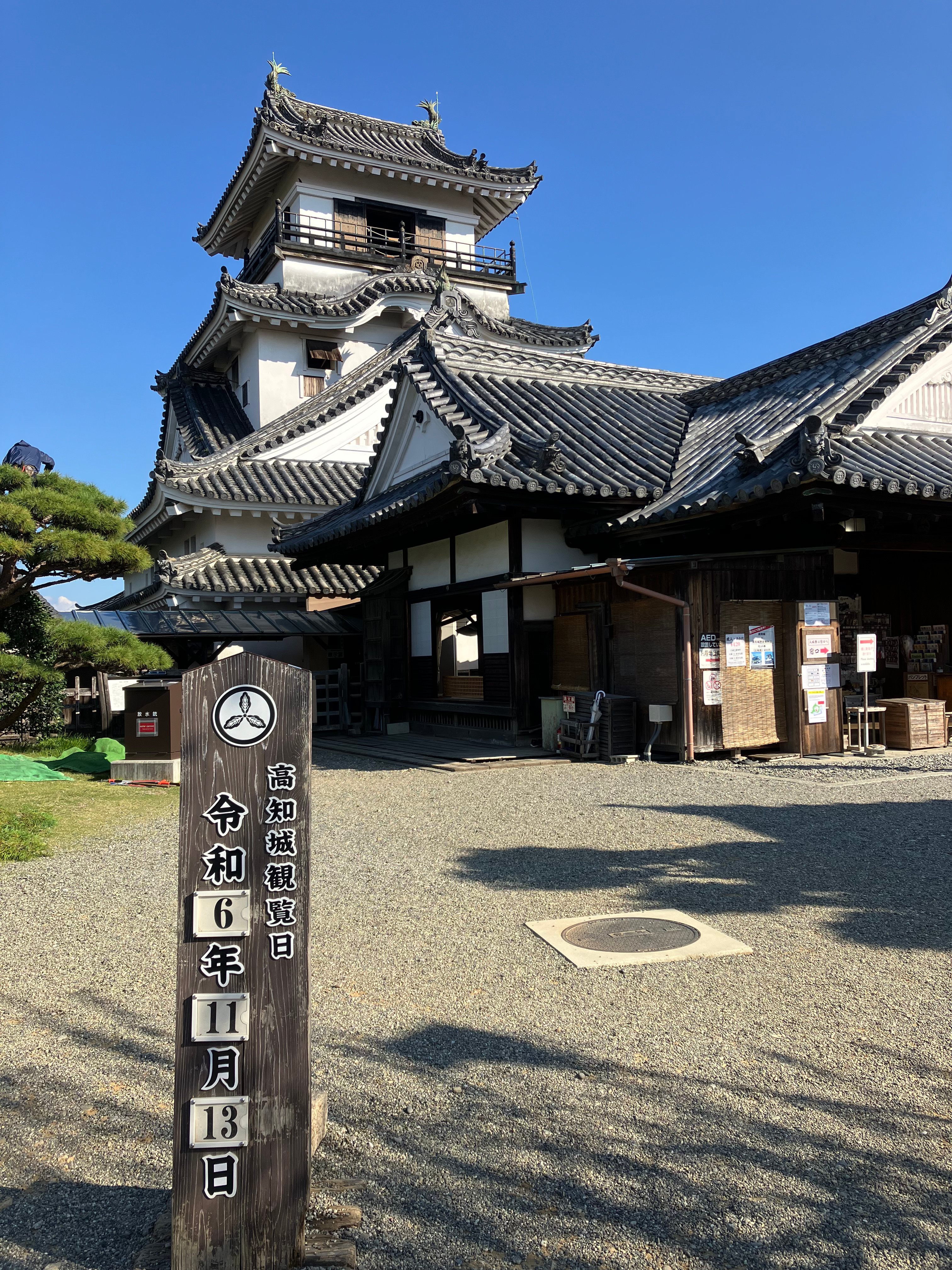 道後温泉から松山自動車道ー高知自動車道を走り、無事に高知城のお膝下高知公園に着きました。高知公園の入り口から遠くに見える高知城に向かいます。城の大手(正面)にふさわしい堂々たる構えを持つ追手門をくぐり、石段を登り、大衆に向かって自由と平等を呼び掛けている板垣退助像や内助の功で有名な一豊の妻、千代の像を見て、詰門を通り本丸に向かう。国の重要文化財、本丸御殿(城主の住居であり、政務や日常生活を行うための施設)、外観4重、内部3層6階建ての天守を見学。なお、高知城は、天守と本丸御殿が現存する唯一の城である。天守からの市内の眺めは絶景。