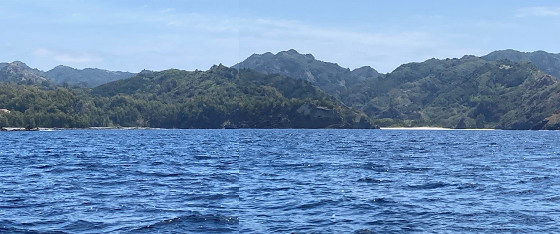 境浦 左端に沈没船の残骸が。 白いビーチは扇浦でしょうか