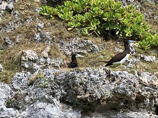 カツオドリのつがいカツオドリ、オナガミズナギドリ、アナドリ...小笠原を代表する3種の海鳥の繁殖地は、父島列島では南島ただ1ヶ所だそうだ