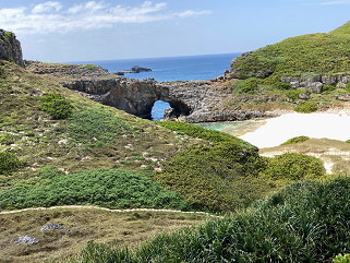タコノキ(蛸の木)の群落がいくつもあります岩場なので這いつくばるような低木状です