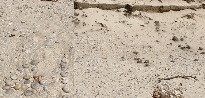 ヒラベソカタマイマイの半化石たくさん転がっています