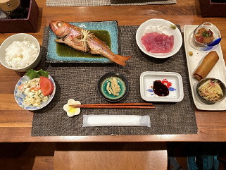 18:02 宿の夕食 サシミはどうやらアオウミガメのようだ