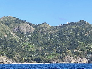 山上に国立天文台小笠原観測所のパラボラアンテナが見える