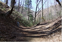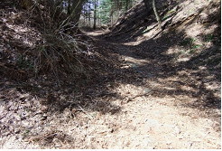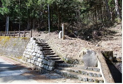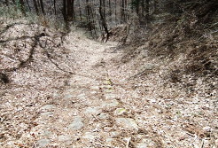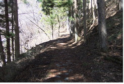 神社の先にある旧中山道、山道への入口すぐにアスファルトの道に出ますが、それを道なりに上って行くと、すぐ「信濃路自然歩道中山道ルート」の案内板が現れますので、それに従って石畳の道に入ります