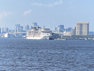 レインボーブリッジを背にして大型のクルーズ船が停泊しています