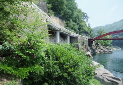 ・木曽の棧は対岸に向けて架けられた橋ではなく、絶壁に並行して横に架けられた棧道
