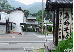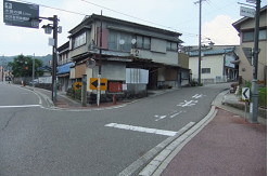 15:19 越前屋(向こう側)とたせや寝覚之床へはこの二軒の間の道を下って行きます