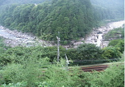 14:09 木曽川が谷の幅いっぱいに流れ、道路は山裾にへばりつくように走っています