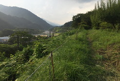 17:00 「荻原」信号の先、荻原沢の橋を渡って100m先を左に入り、ガードを潜って宮戸集落を行くと、突然アスファルトが切れ草の道となり、中央本線の上のこんな所を歩くことになります