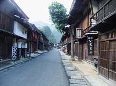 妻籠宿案内板の前から宿場の家並みを眺めます