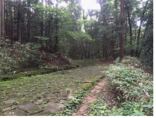 苔むした石畳が800mも続きます木々がうっそうと茂り薄暗い個所もあります