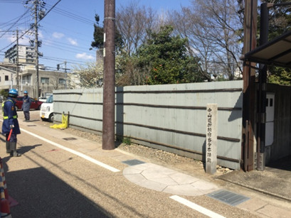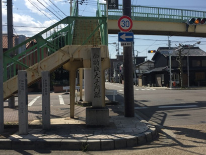 歩道橋のたもとに「加納城大手門跡」の石碑がある