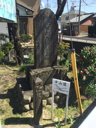 12:30 論田川改修記念碑とその前にある左岐阜道の道標