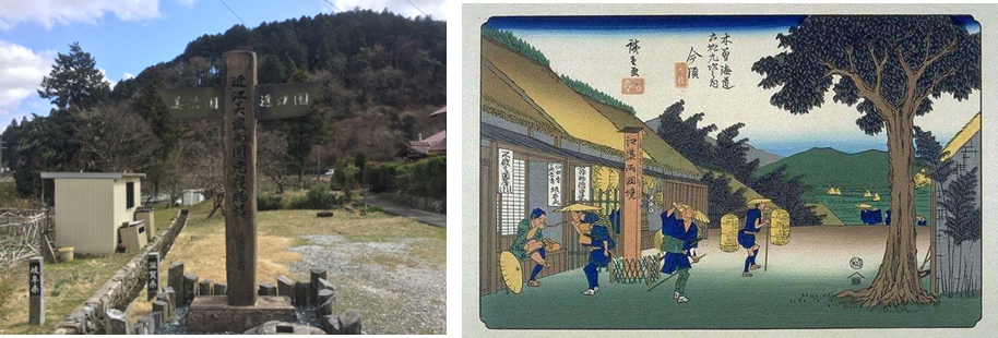 近江美濃両国境寝物語の碑 滋賀県側にあり、近江国長久寺村と標されている碑の左側に国境を示す溝があるこの溝を挟んで両国の茶屋や旅籠があり、壁越しに寝ながら他国の人と話し合えたので、寝物語の里の名が生まれたと言われている