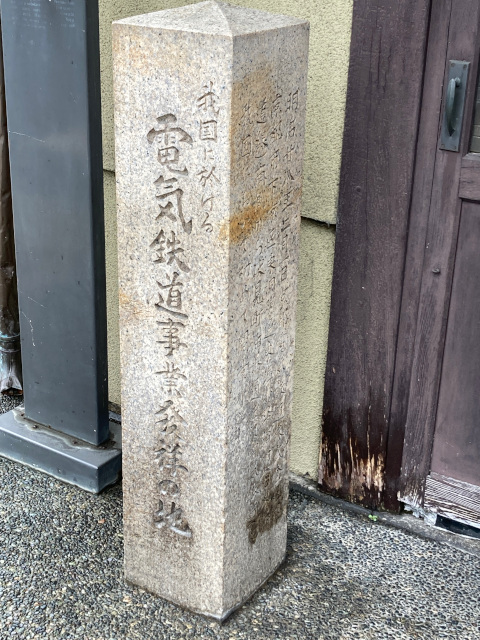 店の前には「電気鉄道事業発祥の地」碑が立つ