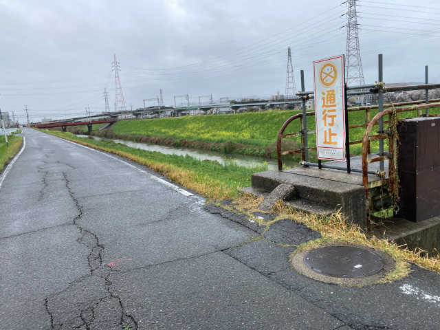 人道橋の先は宇治川の堤防上の道路の端を、