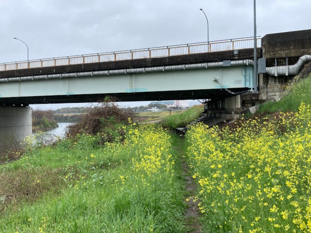 14:28 菜の花の間の踏み分け道を通り橋の下を通過