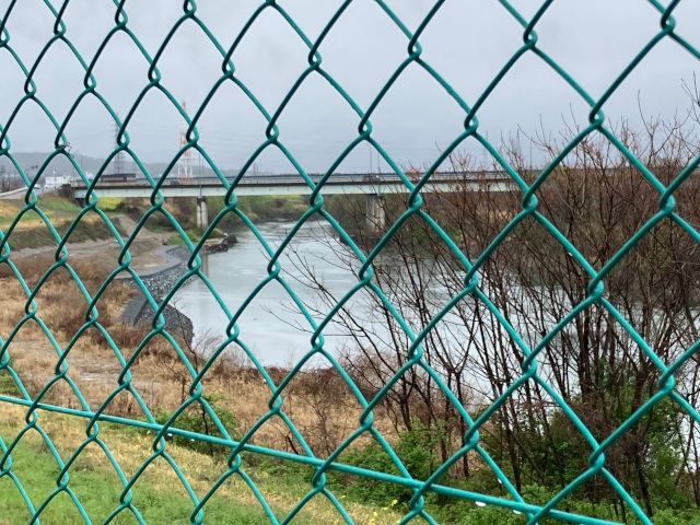 14:37 堤防上に張り巡らされたフェンスの網目越しに