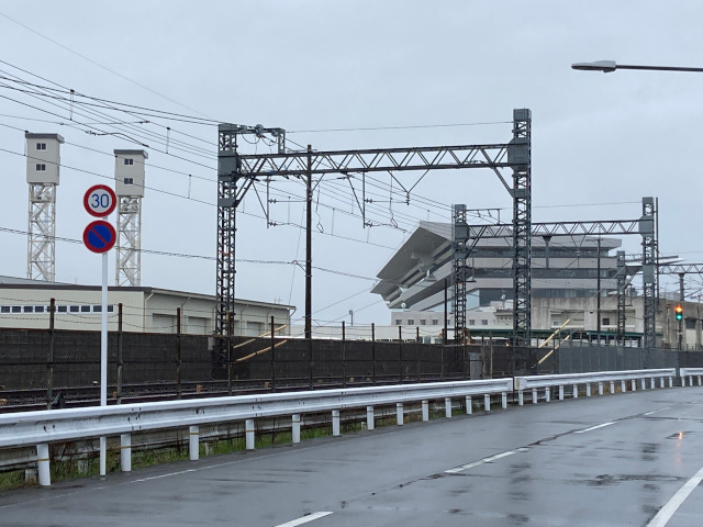 京阪電車の大きな工場の横を通り、京阪電車の高架を
