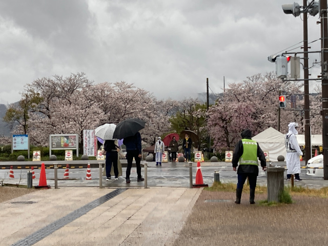 16:32 「さくらであい館」正面から見る背割堤の桜 展望塔には16時を過ぎて到着したため、 上から桜を眺めることができず残念だった
