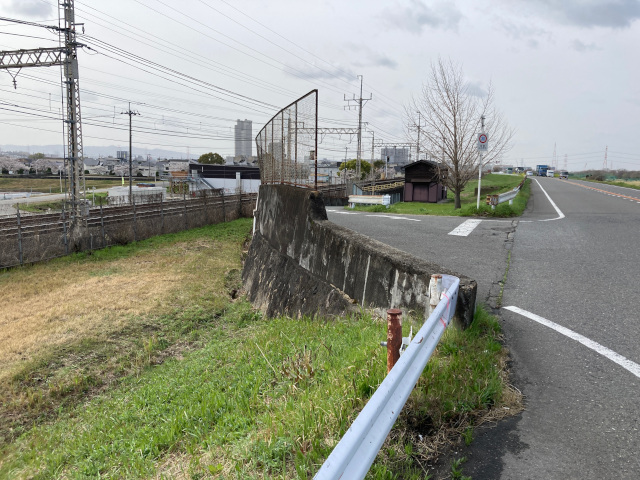 9:29 橋本湯から150mほど先で淀川堤防上の道を進む 川越しにサントリーの山崎蒸留所が かろうじて見える