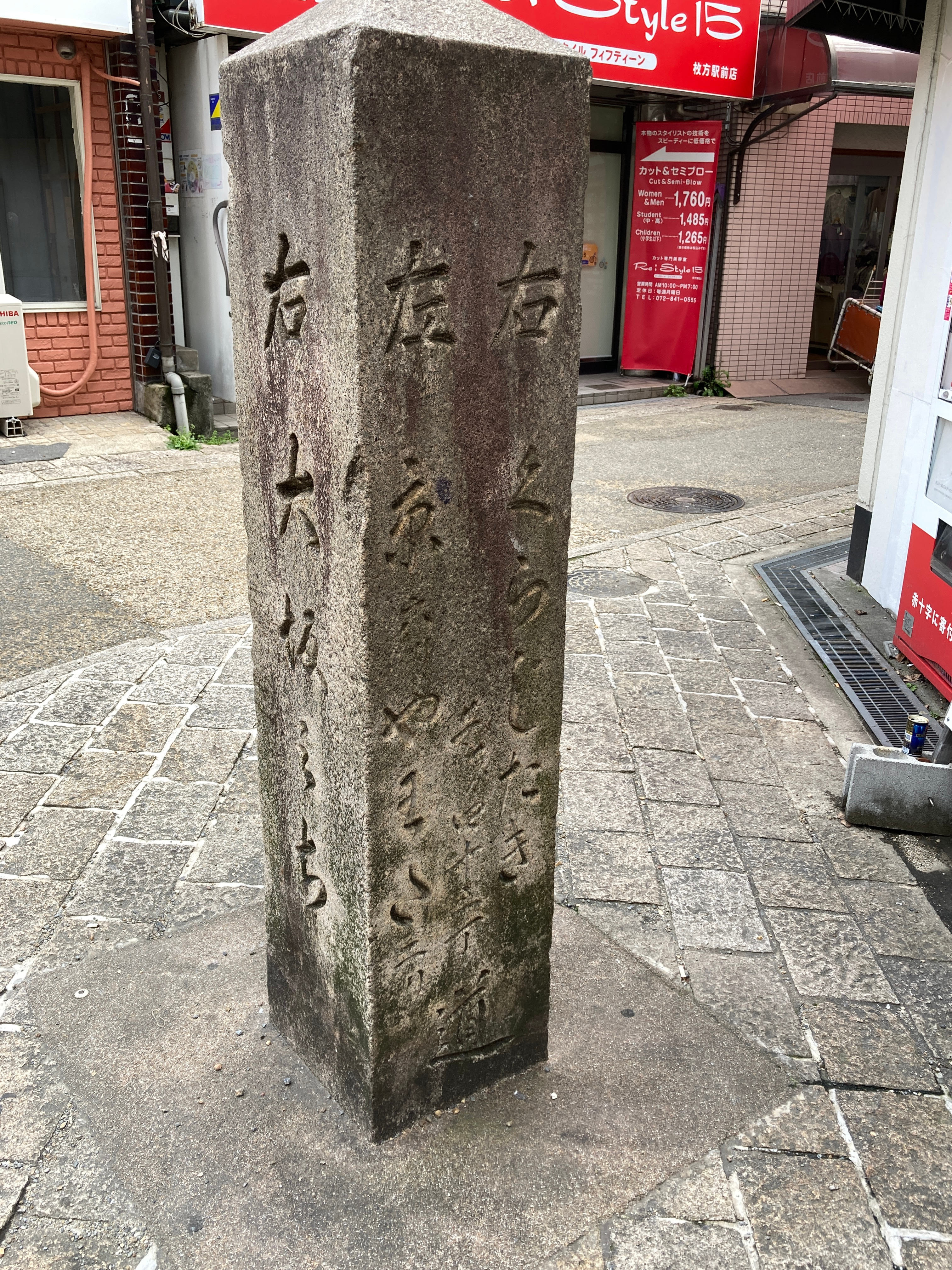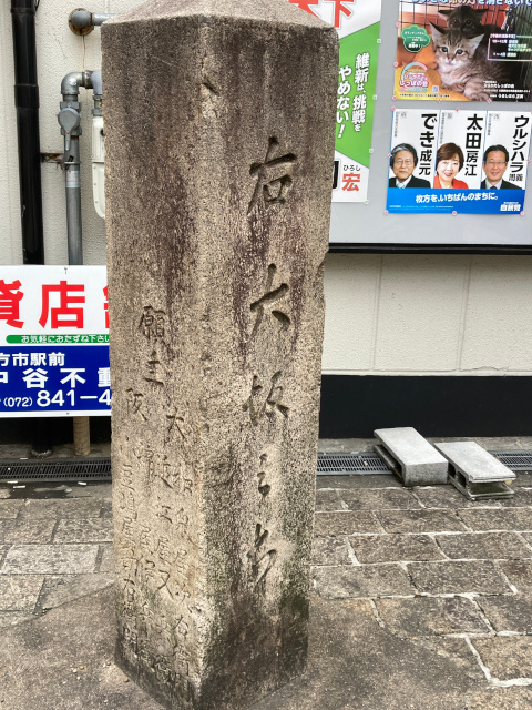11:46 京阪枚方市駅への道を越えると、カーブした先に 枚方橋の親柱があった 元あった川は暗渠となっている