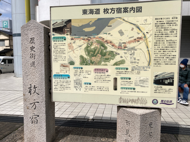11:51 街道はショッピングモール「ビオルネ」を突っ切る 軒を連ねる宿場の入口にある枚方宿案内板