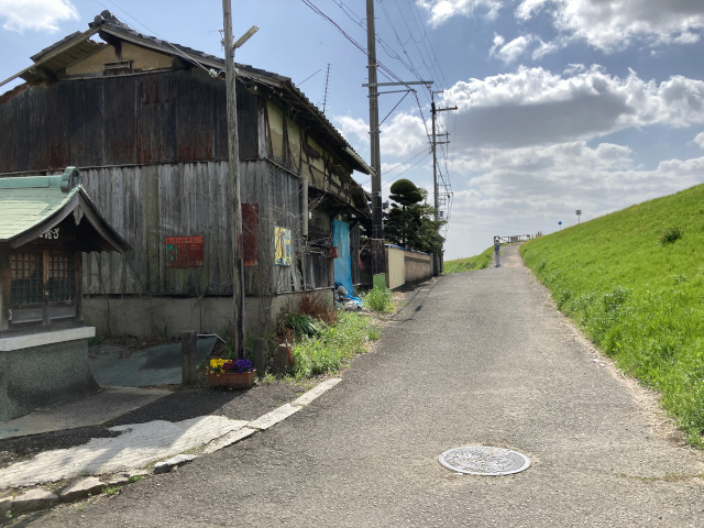 13:25 松ヶ鼻地蔵尊地蔵尊から先、すぐ堤防上には上がらず、堤防下に続く家並の前を約400m進み、家並が切れた先から堤防上の道に上がる堤防上を鳥飼大橋先の七番渡し跡辺りまで(約7㎞弱)歩き、その先で下の道に下りる