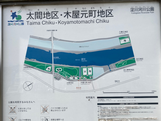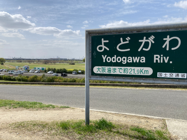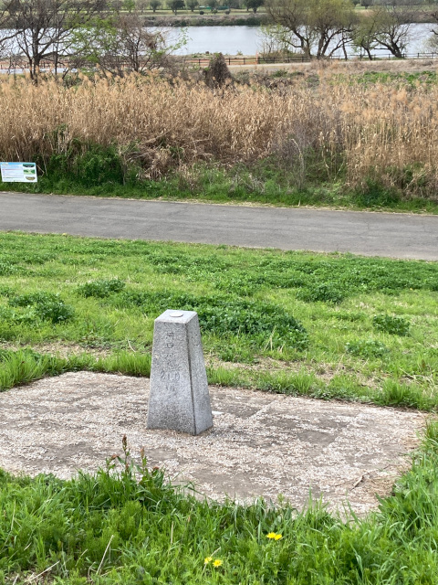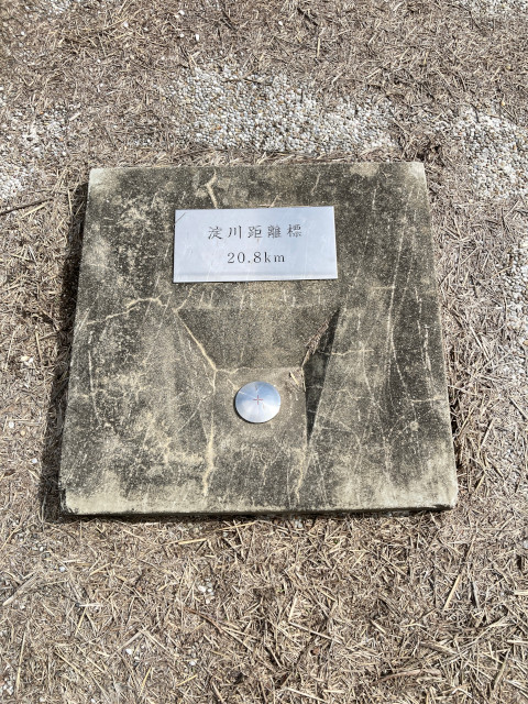 13:46 茨田堤は太間(たいま)地区にあり、淀川堤防上には大阪湾からの距離を示す表示板が設置されている淀川の景色や案内板に気を取られて、茨田堤碑を見落としてしまった