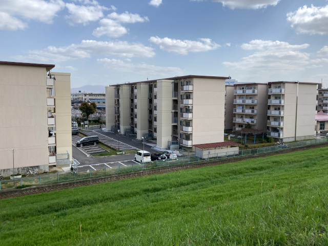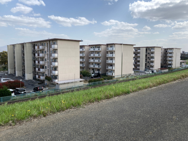 14:16 堤防の内側を眺めると、府営住宅でしょうか土手沿いに5階建ての建物が並んでいますよく見るとエレベーターの付いている所と付いていない所が混在していますが、その違いはどこから来ているのでしょうか