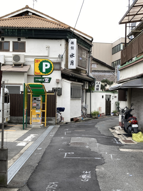 16:59その先目印になるのが「旅館水月」道は右カーブして都島通に出る
