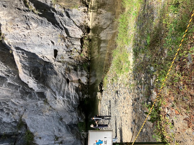 上陸して藤棚をくぐり、橋を渡りると、そこにはさらに高い岸壁が川の対岸にそびえ立つ。岸壁の突き出た部分が獅子の鼻の形に見えることから「猊鼻渓」という名がつけられました。