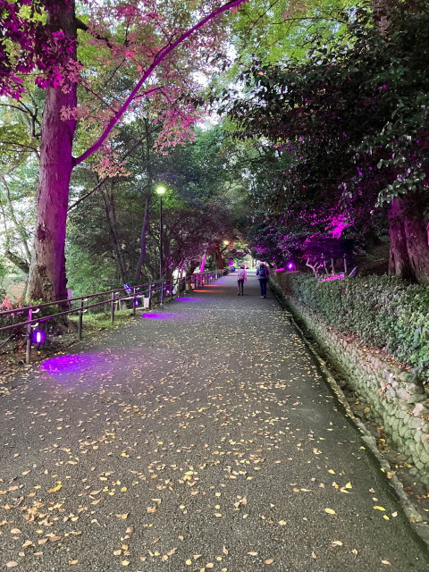 大手門から山上に向かう坂道は、時々立ち止まって振り返えると、坂がきついことに気づかされる。いつしか見返り坂と呼ばれるようになったとか。 坂道の頭上に覆いかぶさる木々、この時期に咲いた草花が、歓迎してくれた。四季折々にその美しさをのぞかせ、心をなごませくれるとのこと。 きつい坂を上り、三の丸に到着、三の丸北側の石垣は、丸亀城の石垣の中で最も高く、20メートル以上の城壁が続き、隅角部の石垣は算木積みされた美しい曲線美で、「扇の勾配」と呼ばれている。 石垣を見上げ、本丸広場に到着。天守の観覧時間が過ぎており、残念ながら、本丸広場から本丸を見上げる。(こんぴらさんで時間をとりすぎた!) 本丸広場から丸亀の町を眺めると、空にはもう真っ赤な夕日が落ちてきた。後ろを振り向くと丸亀城が赤く染まっている。 見返り坂を下ると、明かりが灯る。しばらく下り、振り返ると光りで彩られた坂が浮かびあがる。 丸亀城ホームページはこちら 丸亀観光協会ホームページはこちら