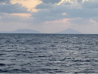 18:13 八丈島の遠景 八丈富士(右)と三原山(左)小笠原航路は伊豆諸島の東側を航行します