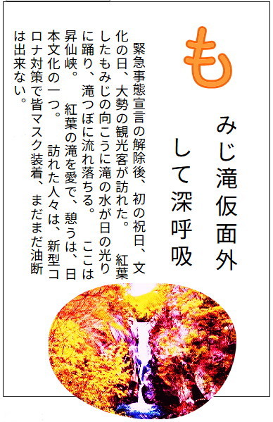 ここは昇仙峡。 紅葉の滝を愛で、憩うは、日本文化の一つ。 訪れた人々は、新型コロナ対策で皆マスク装着、まだまだ油断は出来ない。