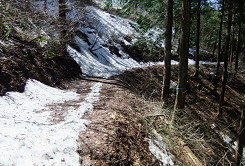 鳥居峠の山頂までは、あと350mある 山かげの雪が深く残っている山道を見て、行くのはあきらめ堀割の方を進んだ
